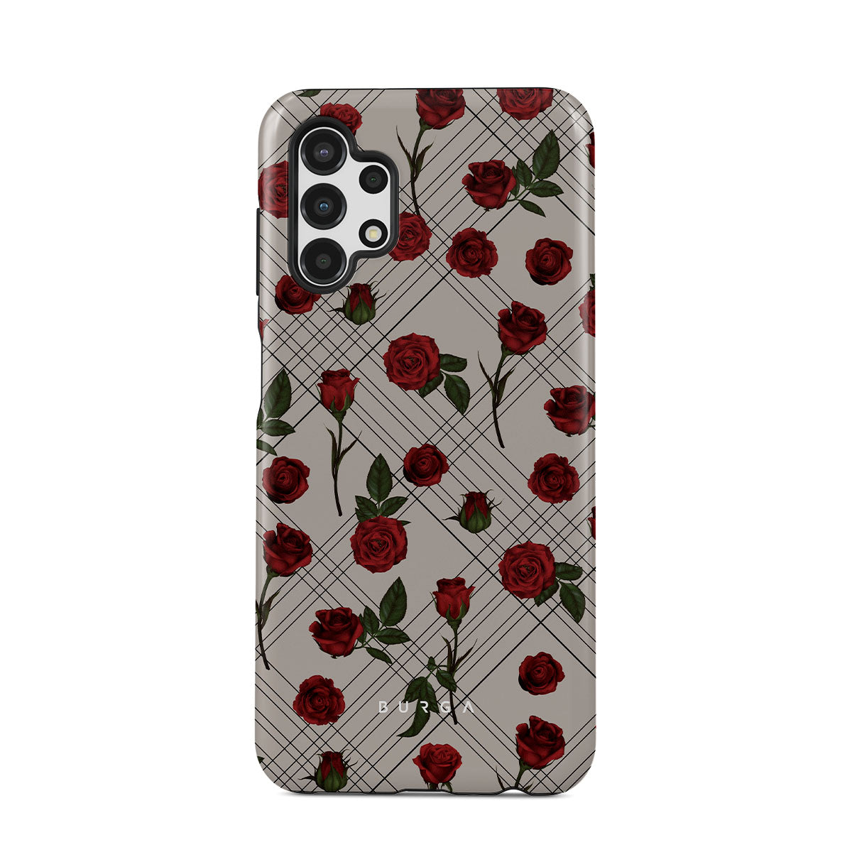 Embrace the subtle rebellion of our Sweet Sin Samsung Galaxy A13 4G phone case design. On a muted nude-gray canvas, scattered small red roses hint at passions hidden beneath the surface. A design that balances the delicate with the daring. Crafted for those who find beauty in the unexpected and wear their edge with elegance.