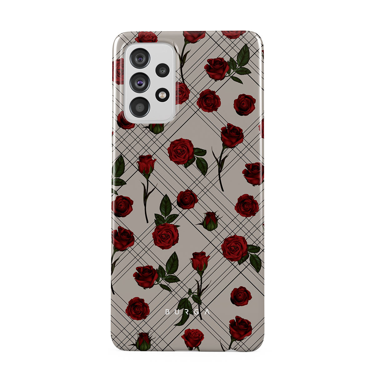 Embrace the subtle rebellion of our Sweet Sin Samsung Galaxy A72 4G / 5G phone case design. On a muted nude-gray canvas, scattered small red roses hint at passions hidden beneath the surface. A design that balances the delicate with the daring. Crafted for those who find beauty in the unexpected and wear their edge with elegance.