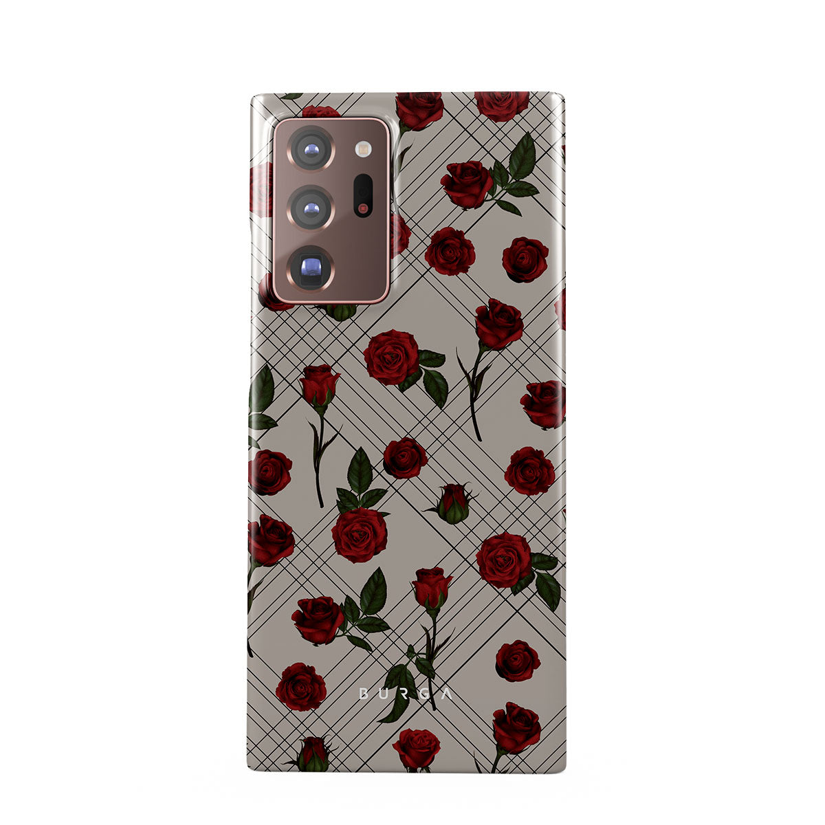 Embrace the subtle rebellion of our Sweet Sin Samsung Galaxy Note 20 Ultra 4G / 5G phone case design. On a muted nude-gray canvas, scattered small red roses hint at passions hidden beneath the surface. A design that balances the delicate with the daring. Crafted for those who find beauty in the unexpected and wear their edge with elegance.