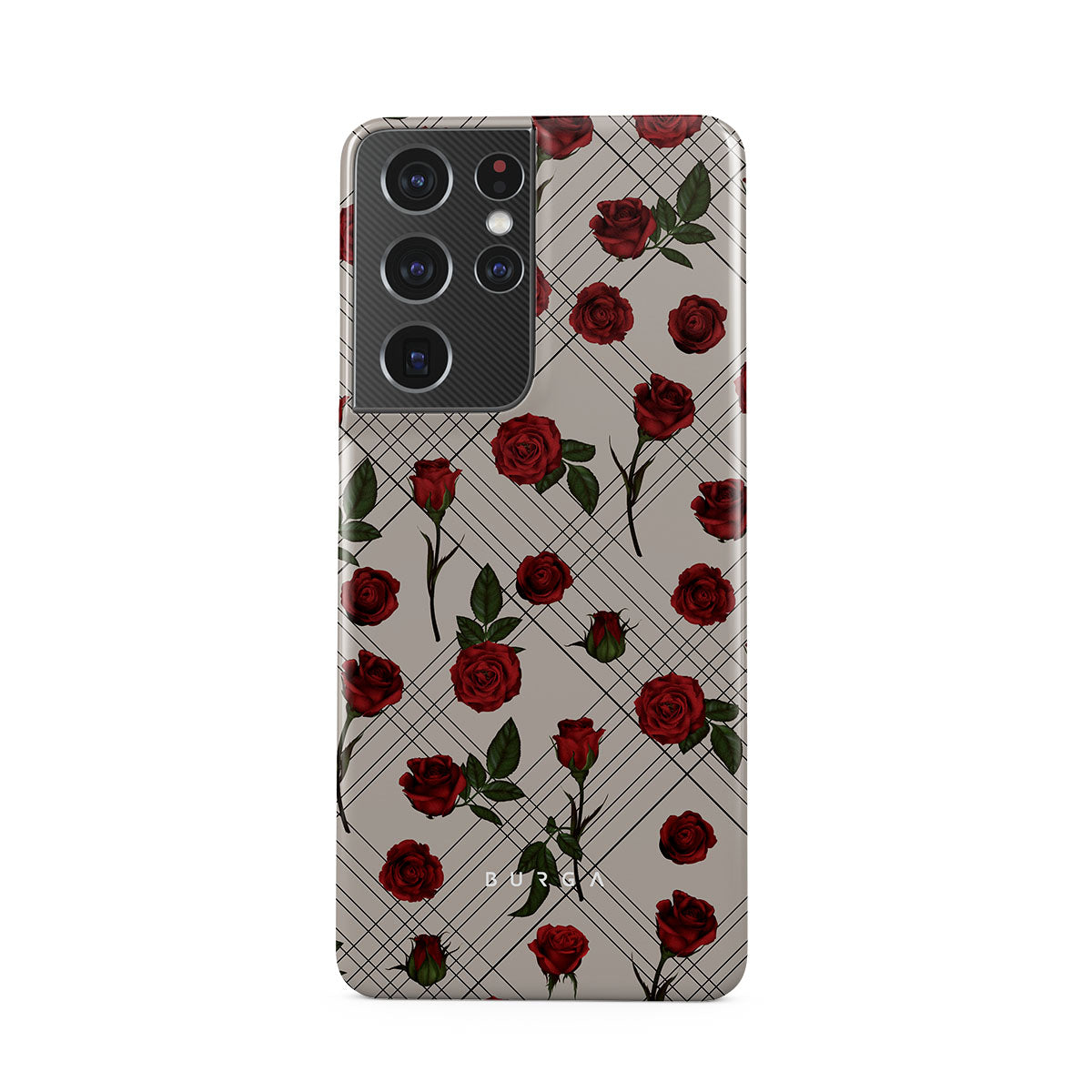 Embrace the subtle rebellion of our Sweet Sin Samsung Galaxy S21 Ultra phone case design. On a muted nude-gray canvas, scattered small red roses hint at passions hidden beneath the surface. A design that balances the delicate with the daring. Crafted for those who find beauty in the unexpected and wear their edge with elegance.