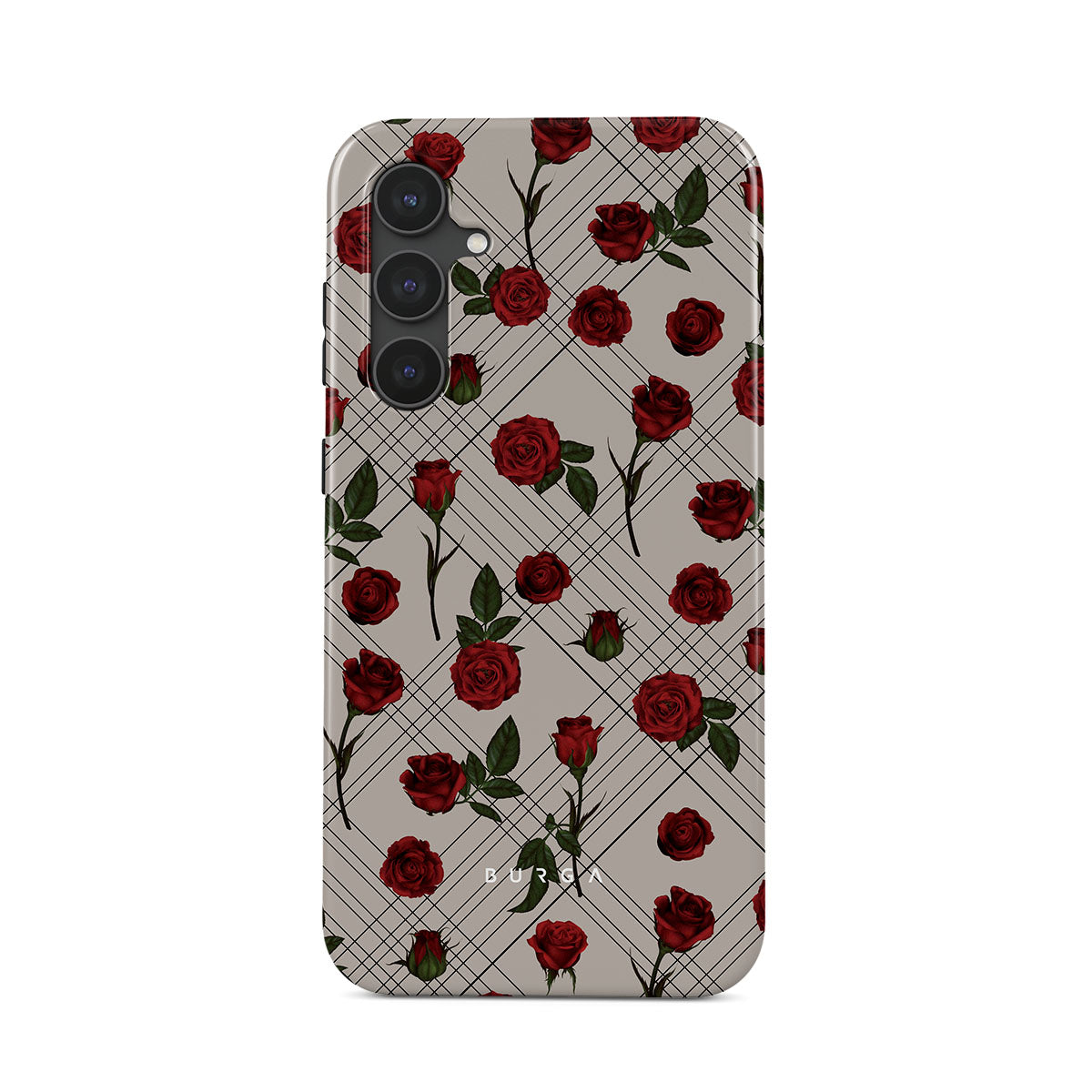 Embrace the subtle rebellion of our Sweet Sin Samsung Galaxy S23 FE phone case design. On a muted nude-gray canvas, scattered small red roses hint at passions hidden beneath the surface. A design that balances the delicate with the daring. Crafted for those who find beauty in the unexpected and wear their edge with elegance.