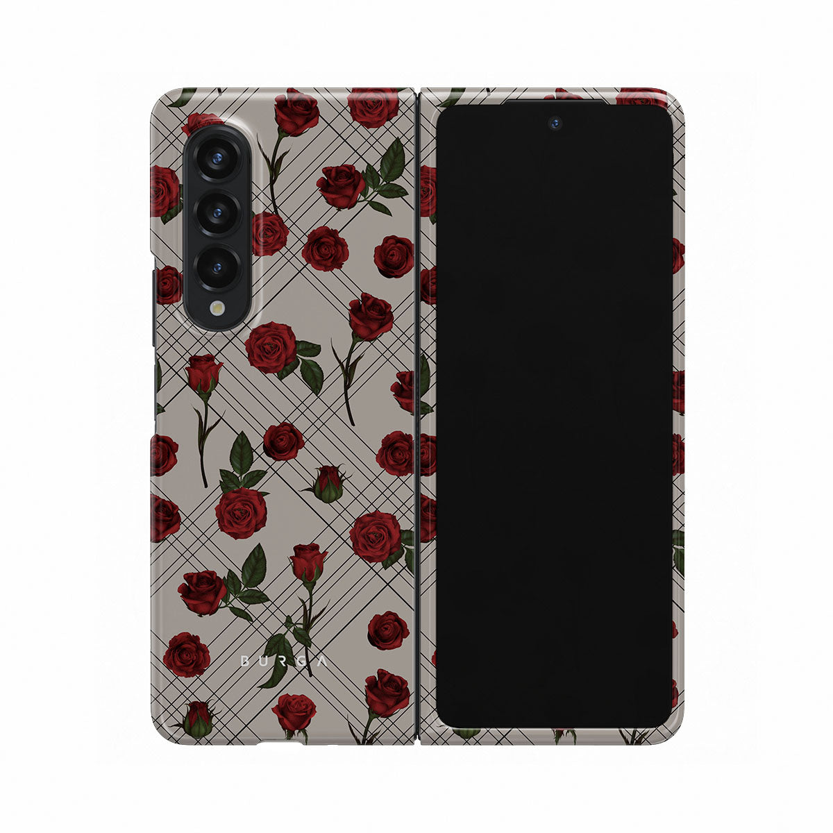 Embrace the subtle rebellion of our Sweet Sin Samsung Galaxy Z Fold 3 phone case design. On a muted nude-gray canvas, scattered small red roses hint at passions hidden beneath the surface. A design that balances the delicate with the daring. Crafted for those who find beauty in the unexpected and wear their edge with elegance.