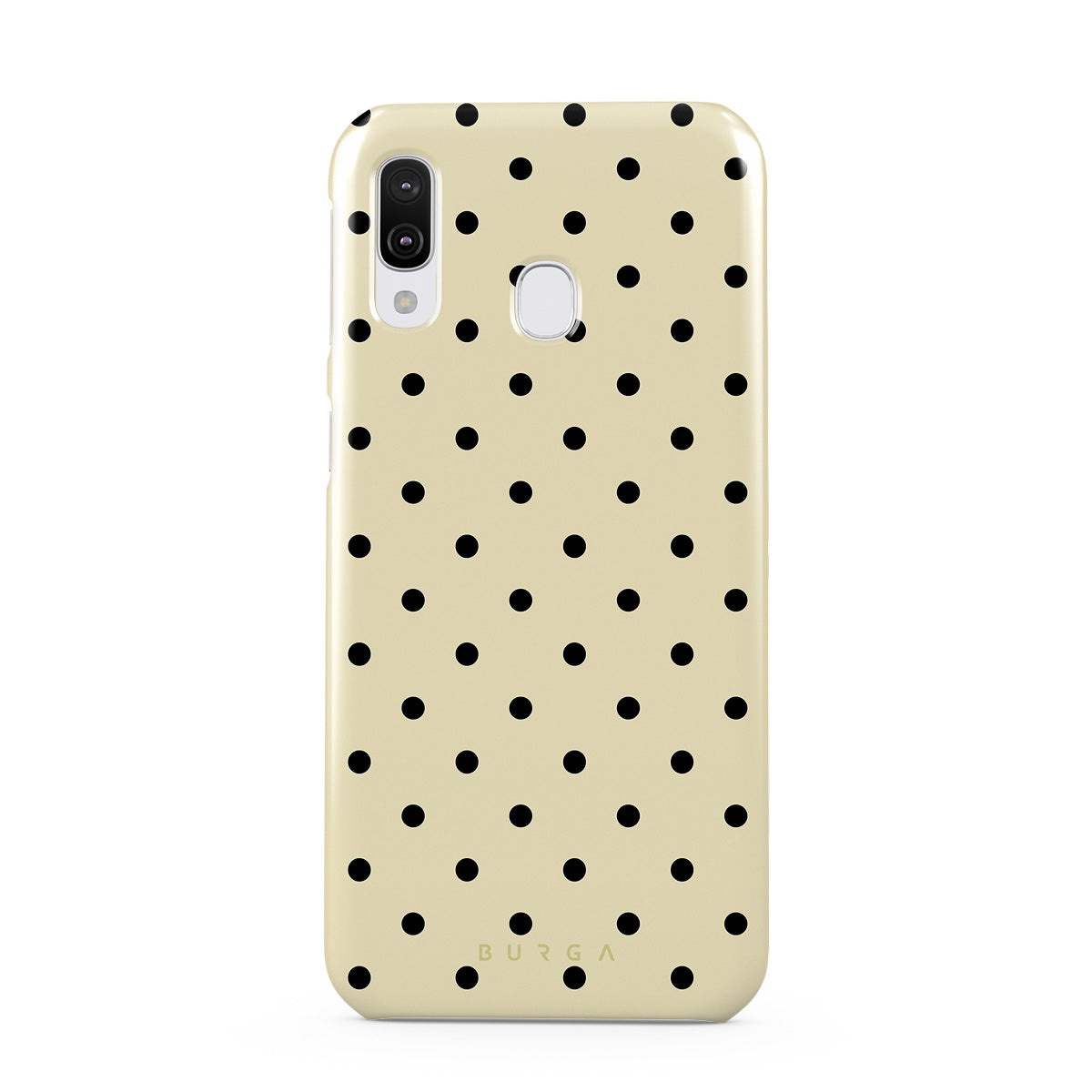 This design features: beige background with small black polka dots.