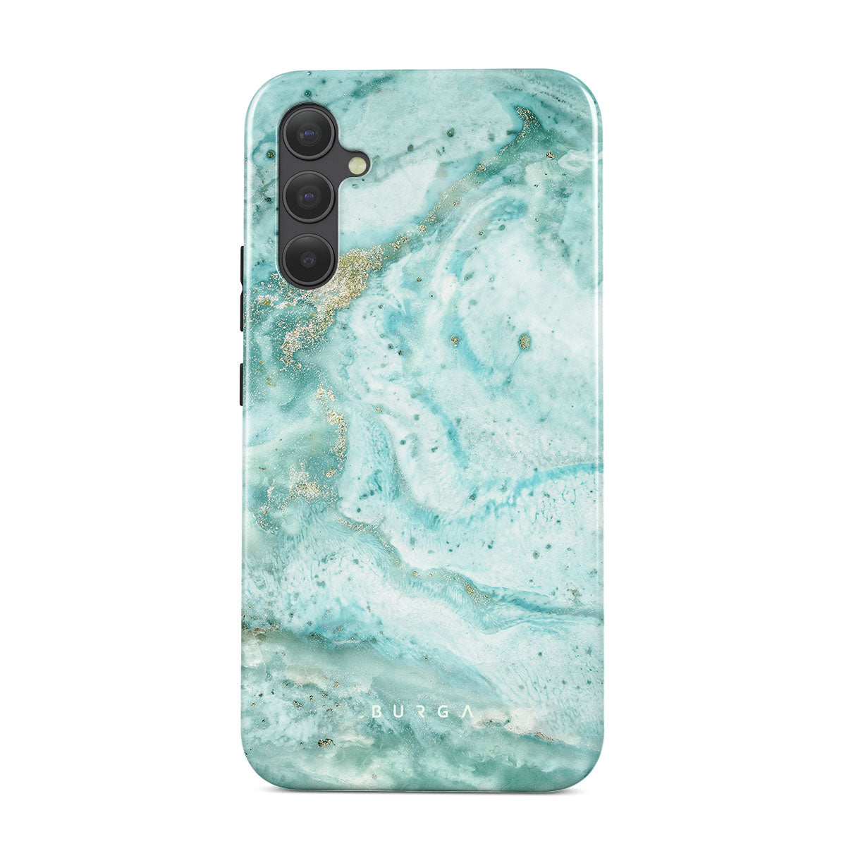 Our Uluwatu Waves Samsung Galaxy A34 phone case is an absolute teal dream. This phone cover features timeless and soft blue marble pattern enriched with golden color specks will surely remind you of a tropical beach teal waters while becoming a protective best friend for your cell phone.