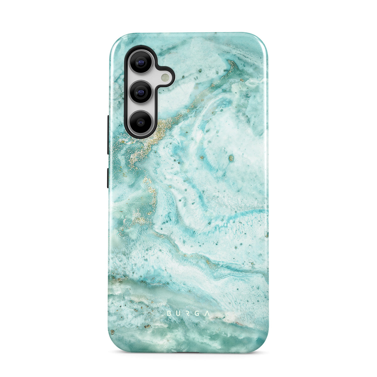 Our Uluwatu Waves Samsung Galaxy A51 phone case is an absolute teal dream. This phone cover features timeless and soft blue marble pattern enriched with golden color specks will surely remind you of a tropical beach teal waters while becoming a protective best friend for your cell phone.