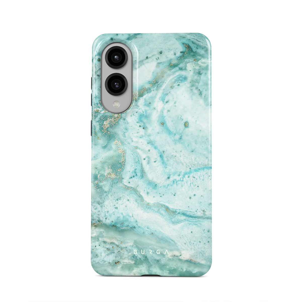 Our Uluwatu Waves Samsung Galaxy S25 Edge phone case is an absolute teal dream. This phone cover features timeless and soft blue marble pattern enriched with golden color specks will surely remind you of a tropical beach teal waters while becoming a protective best friend for your cell phone.