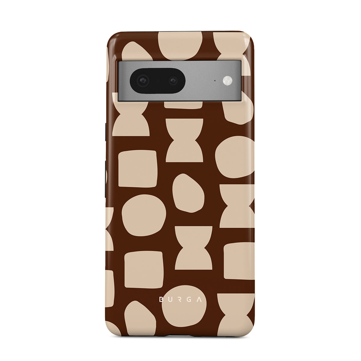 Our Terracotta Google Pixel 7 phone case design whispers warmth and grounded energy. Against a rich brown background, an interplay of light shapes unfolds, captivating the eye with an array of circles, squares, and hourglasses. Each shape is a testament to the beauty found in simplicity.