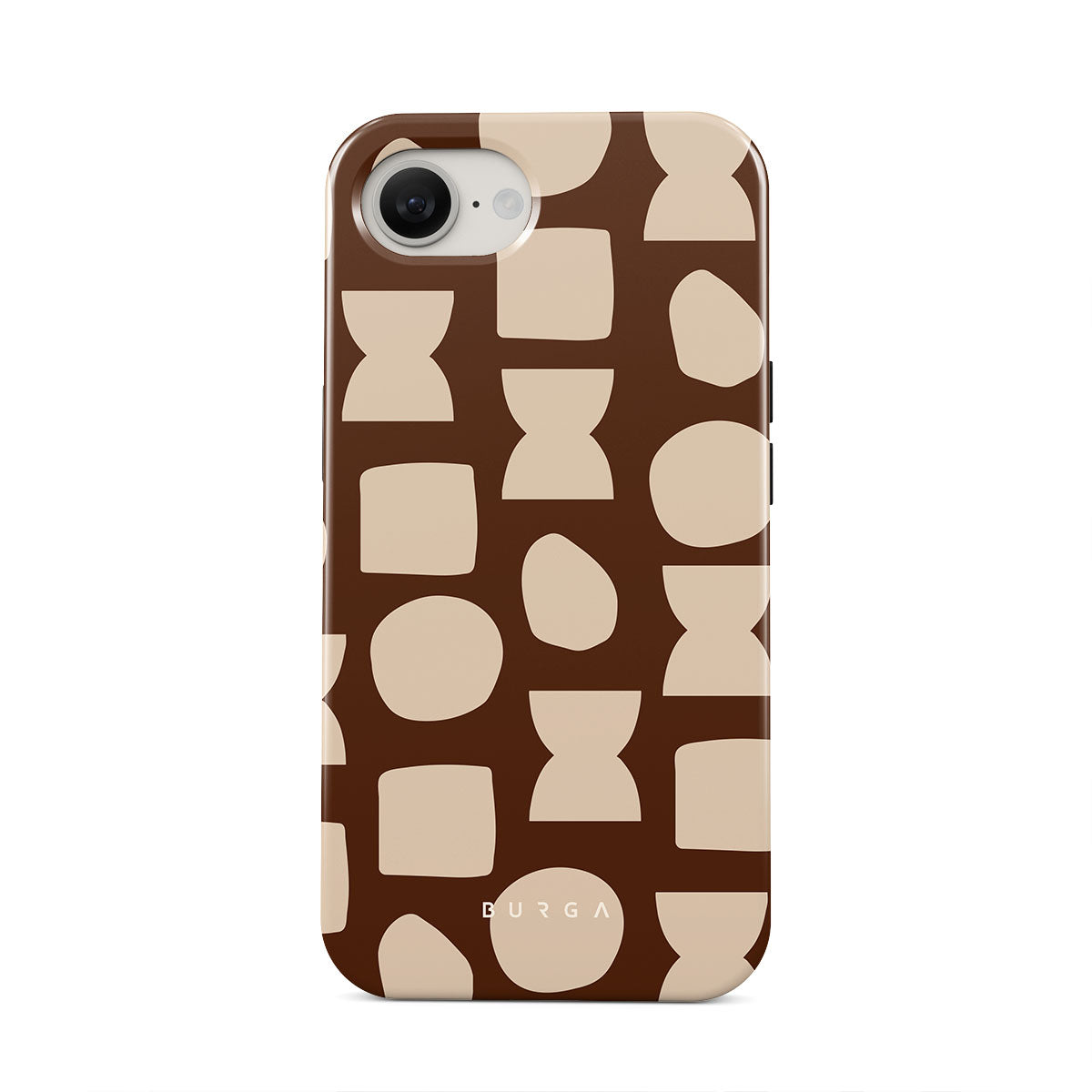 Our Terracotta iPhone 16e phone case design whispers warmth and grounded energy. Against a rich brown background, an interplay of light shapes unfolds, captivating the eye with an array of circles, squares, and hourglasses. Each shape is a testament to the beauty found in simplicity.