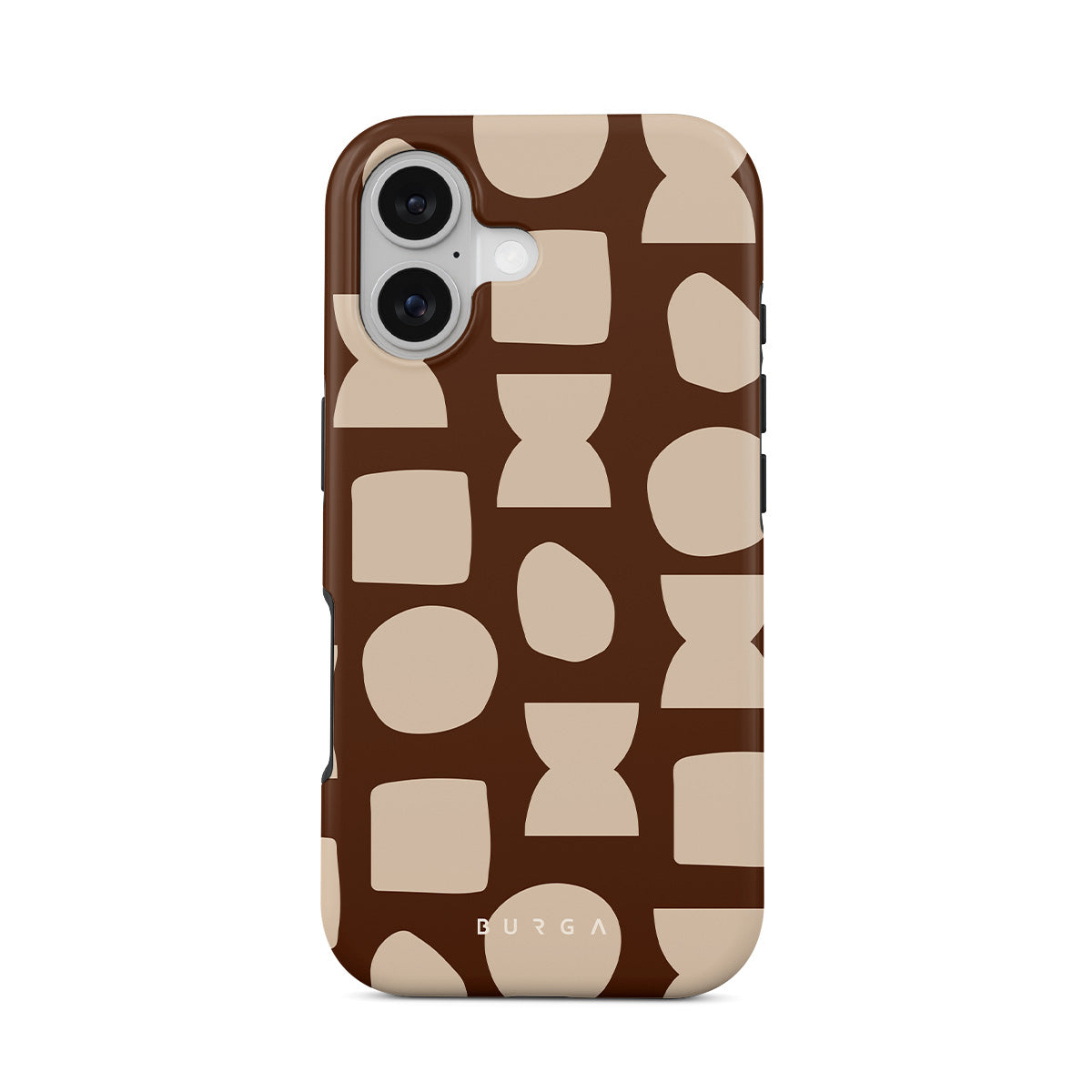 Our Terracotta iPhone 17 phone case design whispers warmth and grounded energy. Against a rich brown background, an interplay of light shapes unfolds, captivating the eye with an array of circles, squares, and hourglasses. Each shape is a testament to the beauty found in simplicity.