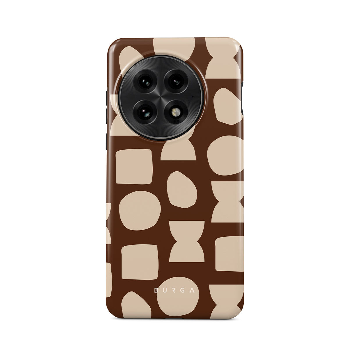 Our Terracotta OnePlus 13 phone case design whispers warmth and grounded energy. Against a rich brown background, an interplay of light shapes unfolds, captivating the eye with an array of circles, squares, and hourglasses. Each shape is a testament to the beauty found in simplicity.