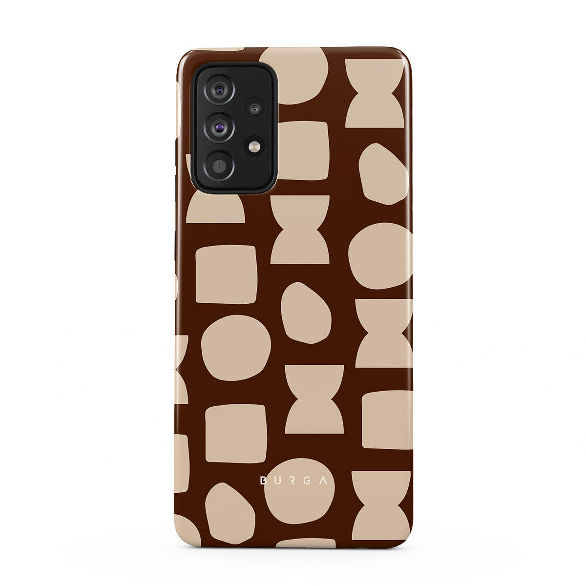 Our Terracotta Samsung Galaxy A52 / A52S 4G / 5G phone case design whispers warmth and grounded energy. Against a rich brown background, an interplay of light shapes unfolds, captivating the eye with an array of circles, squares, and hourglasses. Each shape is a testament to the beauty found in simplicity.