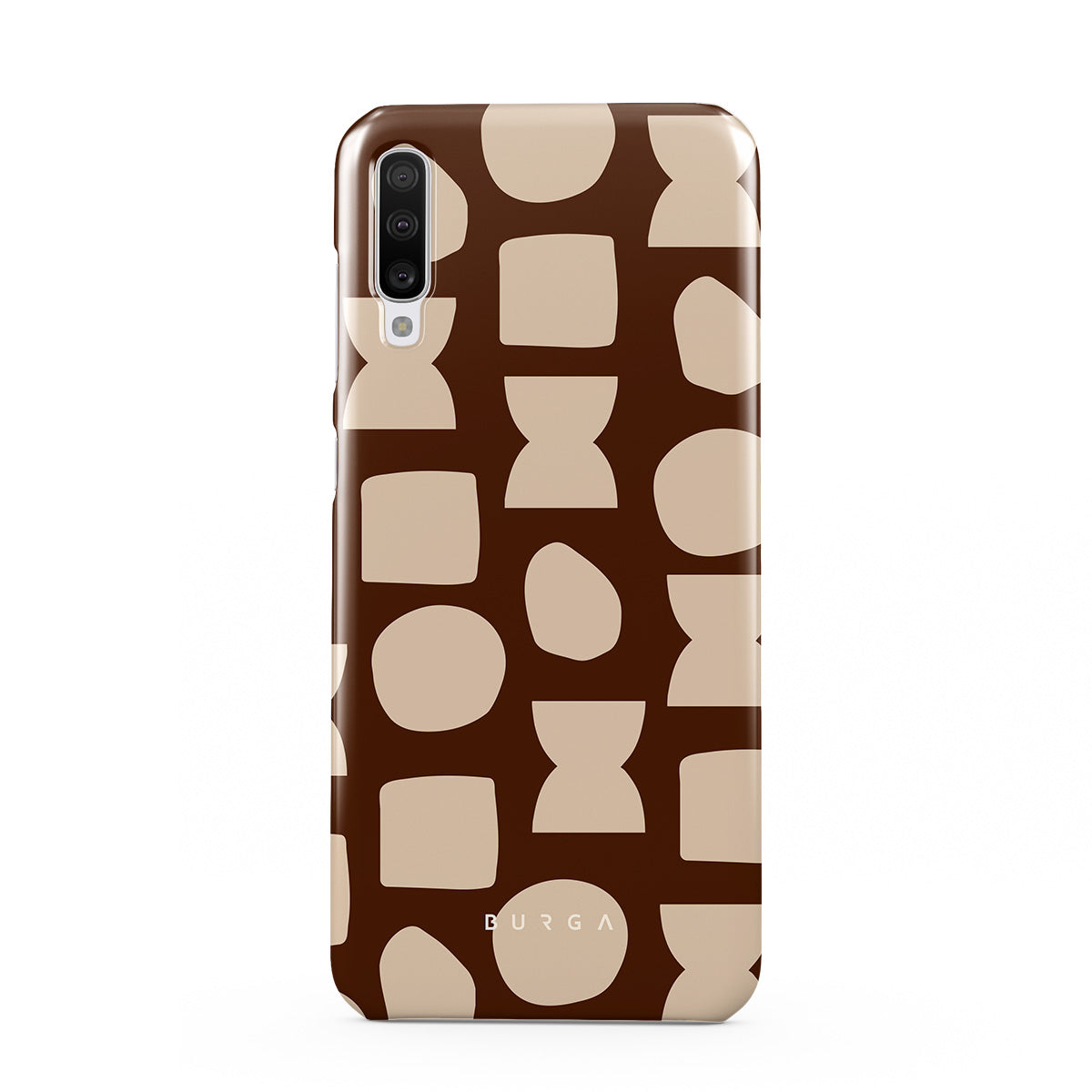 Our Terracotta Samsung Galaxy A70 phone case design whispers warmth and grounded energy. Against a rich brown background, an interplay of light shapes unfolds, captivating the eye with an array of circles, squares, and hourglasses. Each shape is a testament to the beauty found in simplicity.