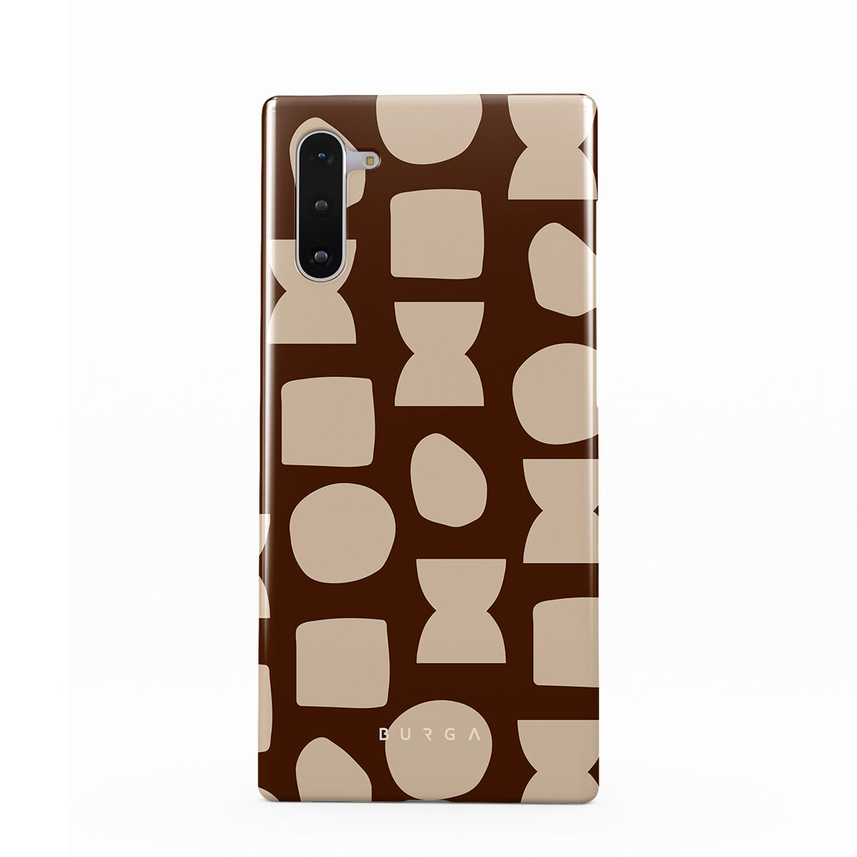 Our Terracotta Samsung Galaxy Note 10 phone case design whispers warmth and grounded energy. Against a rich brown background, an interplay of light shapes unfolds, captivating the eye with an array of circles, squares, and hourglasses. Each shape is a testament to the beauty found in simplicity.