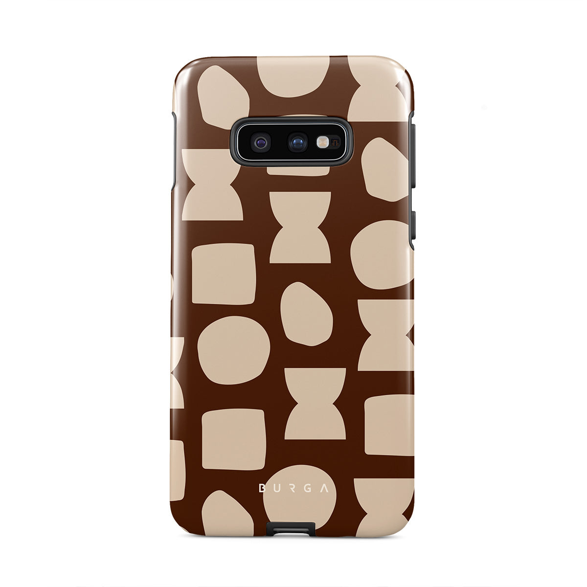 Our Terracotta Samsung Galaxy S10E phone case design whispers warmth and grounded energy. Against a rich brown background, an interplay of light shapes unfolds, captivating the eye with an array of circles, squares, and hourglasses. Each shape is a testament to the beauty found in simplicity.
