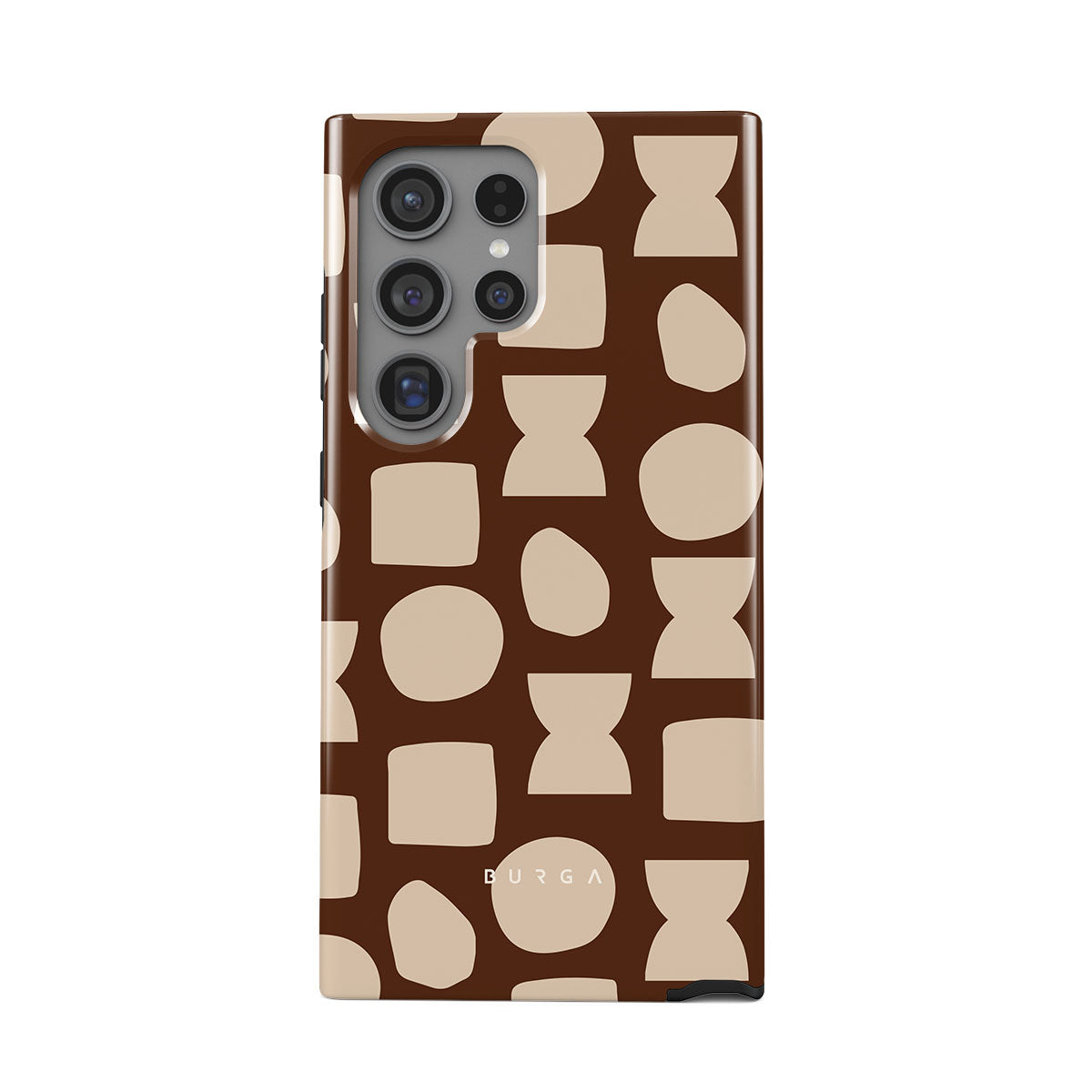 Our Terracotta Samsung Galaxy S24 Ultra phone case design whispers warmth and grounded energy. Against a rich brown background, an interplay of light shapes unfolds, captivating the eye with an array of circles, squares, and hourglasses. Each shape is a testament to the beauty found in simplicity.