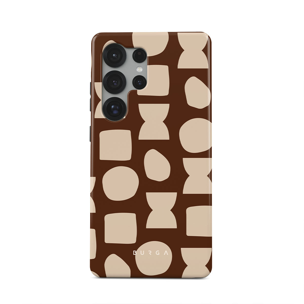 Our Terracotta Samsung Galaxy S25 Ultra phone case design whispers warmth and grounded energy. Against a rich brown background, an interplay of light shapes unfolds, captivating the eye with an array of circles, squares, and hourglasses. Each shape is a testament to the beauty found in simplicity.