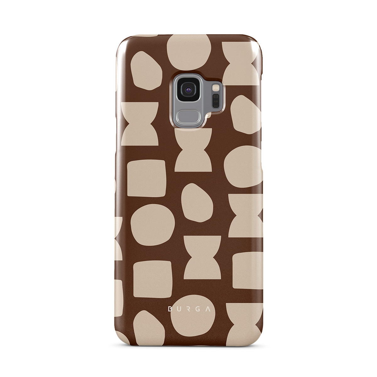 Our Terracotta Samsung Galaxy S9 phone case design whispers warmth and grounded energy. Against a rich brown background, an interplay of light shapes unfolds, captivating the eye with an array of circles, squares, and hourglasses. Each shape is a testament to the beauty found in simplicity.