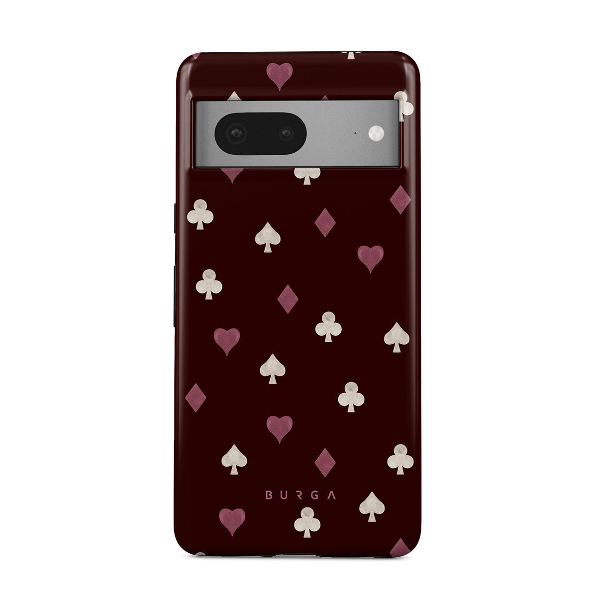 Nothing is as it appears. Hearts, clubs, diamonds, and spades—stacked in your favor or playing against you? This Google Pixel 7 phone case design features a rich burgundy background and minimalist suits that make for a game where the rules are constantly shifting.