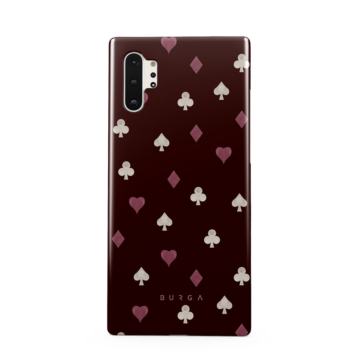 Nothing is as it appears. Hearts, clubs, diamonds, and spades—stacked in your favor or playing against you? This Samsung Galaxy Note 10 Plus phone case design features a rich burgundy background and minimalist suits that make for a game where the rules are constantly shifting.