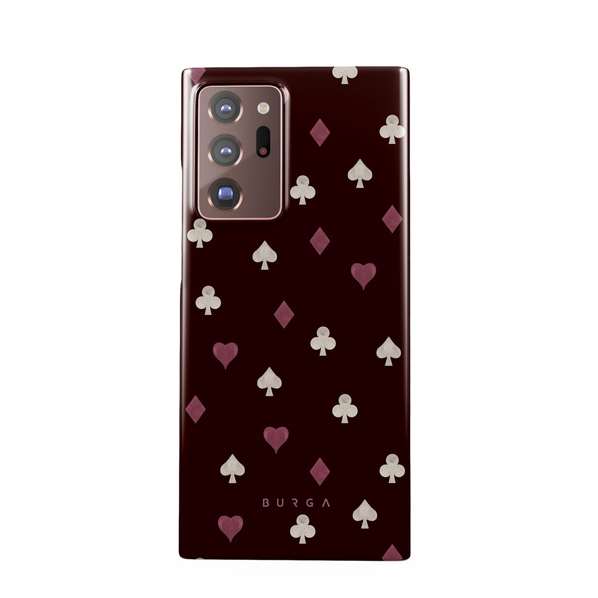 Nothing is as it appears. Hearts, clubs, diamonds, and spades—stacked in your favor or playing against you? This Samsung Galaxy Note 20 Ultra 4G / 5G phone case design features a rich burgundy background and minimalist suits that make for a game where the rules are constantly shifting.
