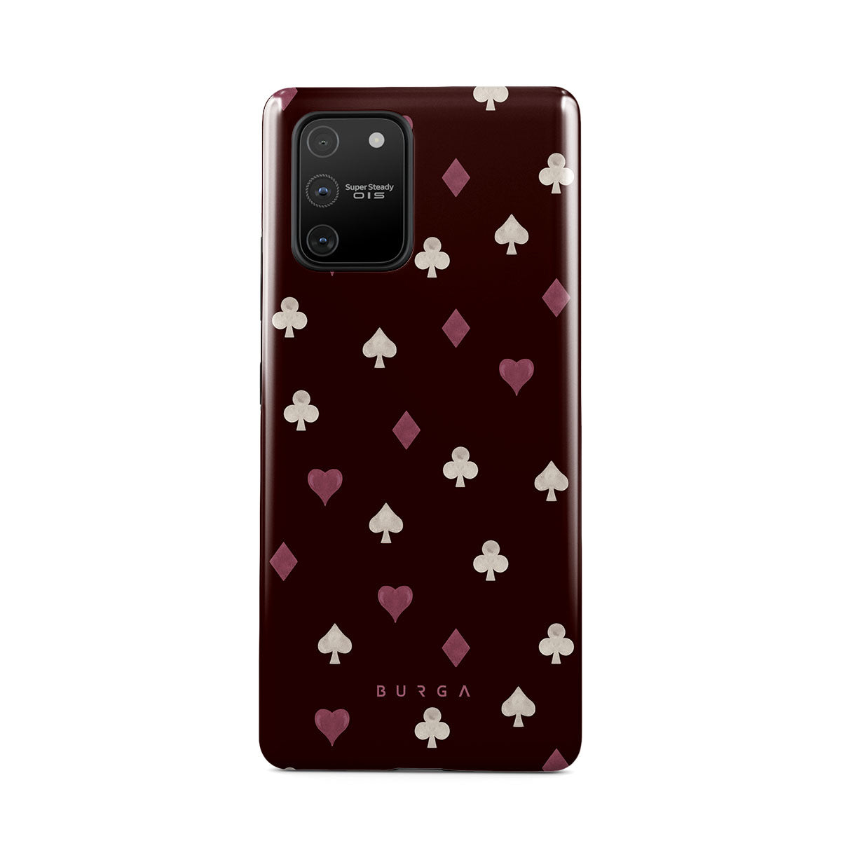 Nothing is as it appears. Hearts, clubs, diamonds, and spades—stacked in your favor or playing against you? This Samsung Galaxy S10 Lite phone case design features a rich burgundy background and minimalist suits that make for a game where the rules are constantly shifting.