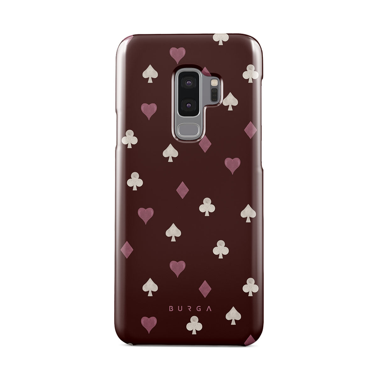 Nothing is as it appears. Hearts, clubs, diamonds, and spades—stacked in your favor or playing against you? This Samsung Galaxy S9 Plus phone case design features a rich burgundy background and minimalist suits that make for a game where the rules are constantly shifting.