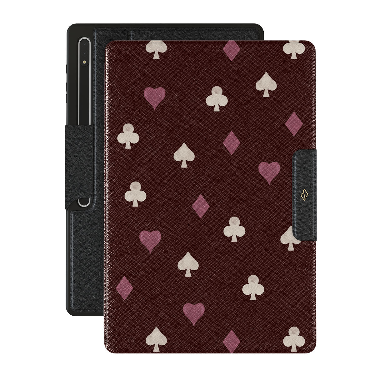 Nothing is as it appears. Hearts, clubs, diamonds, and spades—stacked in your favor or playing against you? This Samsung Galaxy Tab S8 Ultra folio case design features a rich burgundy background and minimalist suits that make for a game where the rules are constantly shifting.