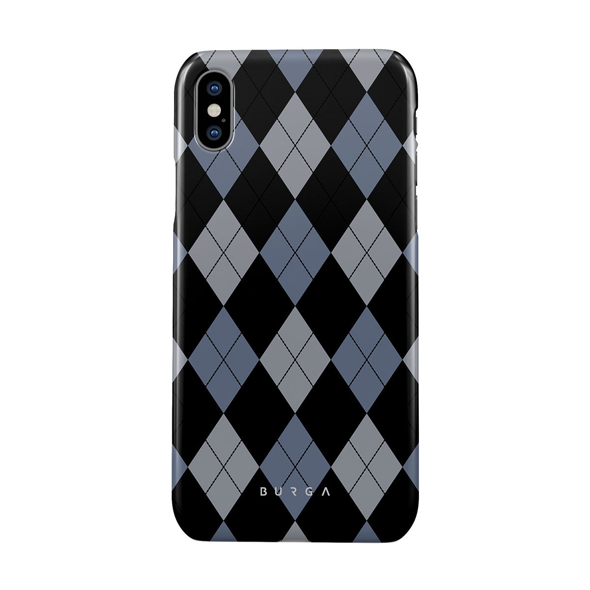 Discover our Trouble iPhone XS Max phone case design—a classic argyle pattern featuring stark black diamonds that seamlessly blend with two distinct shades of blue. Made for those who respect the classics but aren't afraid to disrupt the norm.