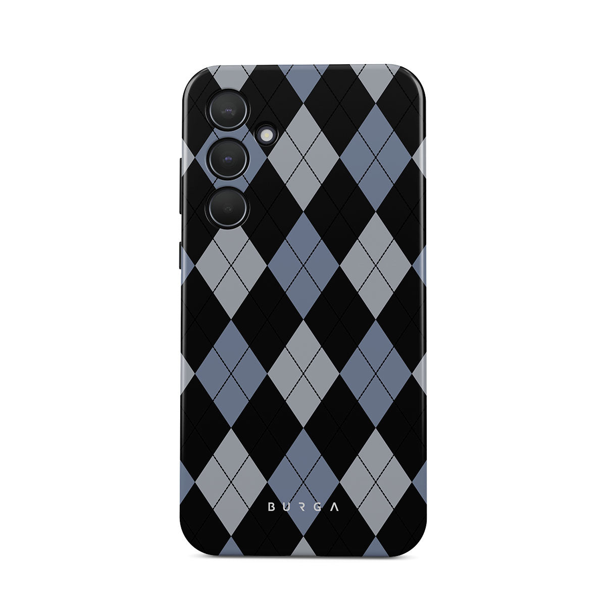 Discover our Trouble Samsung Galaxy A35 phone case design—a classic argyle pattern featuring stark black diamonds that seamlessly blend with two distinct shades of blue. Made for those who respect the classics but aren't afraid to disrupt the norm.