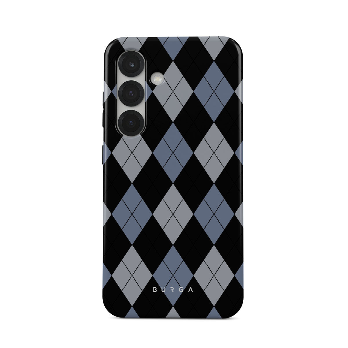 Discover our Trouble Samsung Galaxy S25 phone case design—a classic argyle pattern featuring stark black diamonds that seamlessly blend with two distinct shades of blue. Made for those who respect the classics but aren't afraid to disrupt the norm.