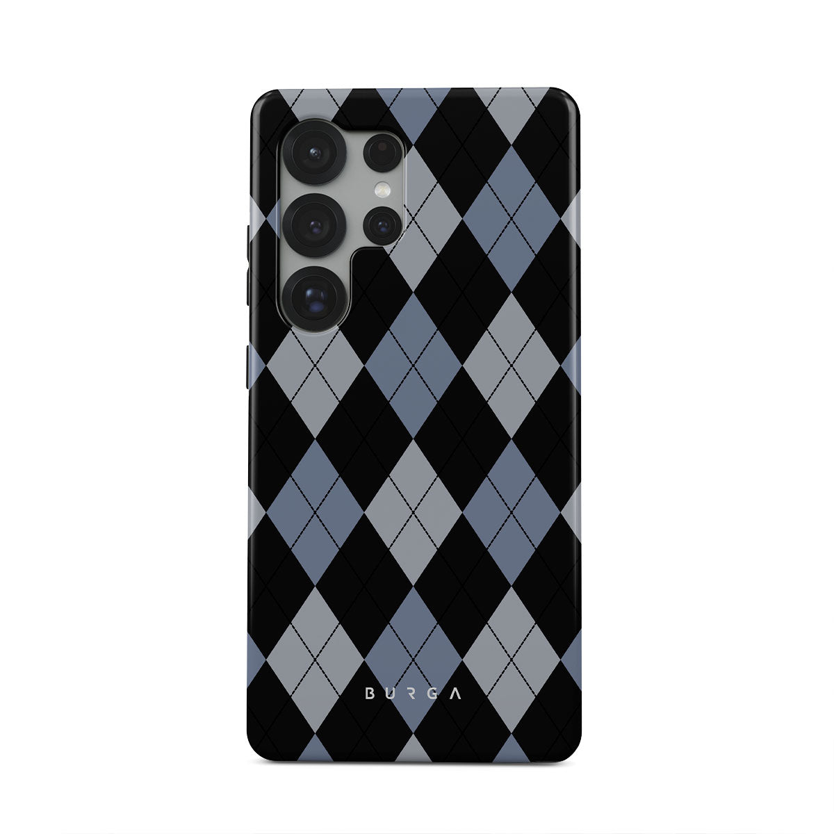 Discover our Trouble Samsung Galaxy S25 Ultra phone case design—a classic argyle pattern featuring stark black diamonds that seamlessly blend with two distinct shades of blue. Made for those who respect the classics but aren't afraid to disrupt the norm.