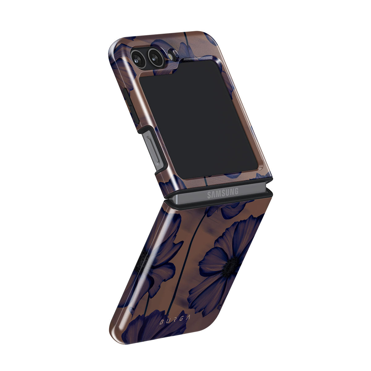 Discover our Velvet Night design. On a soft nude backdrop, blue poppies dance in the untamed rhythm of the wind. A blend of night's peace and daring energy, this Samsung Galaxy Z Flip 5 phone case is perfect for those who dream big and seek adventure.