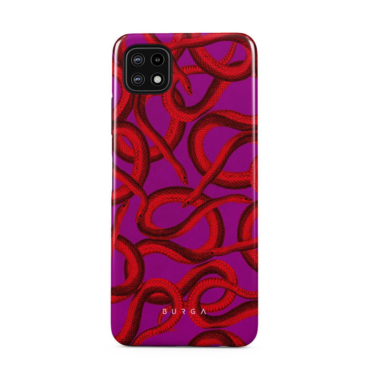 Watch Out Samsung Galaxy A22 5G phone case design offers a fierce feel with a bright magenta colored background covered in red snakes pattern. Make a statement while protecting your phone, as this case is guaranteed to catch everyone's eye.