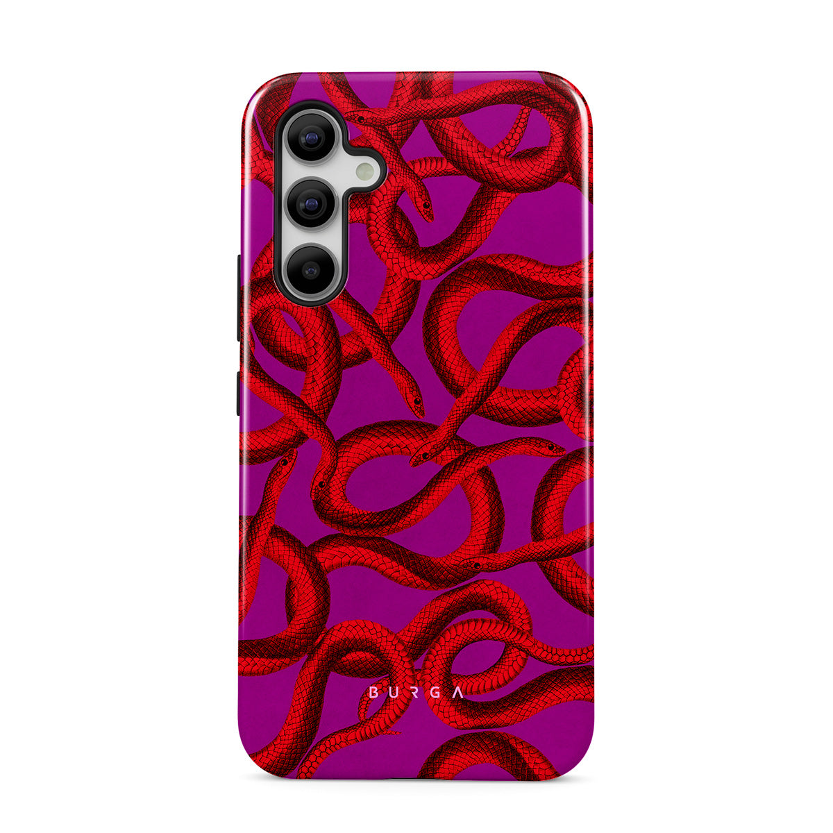 Watch Out Samsung Galaxy A55 phone case design offers a fierce feel with a bright magenta colored background covered in red snakes pattern. Make a statement while protecting your phone, as this case is guaranteed to catch everyone's eye.