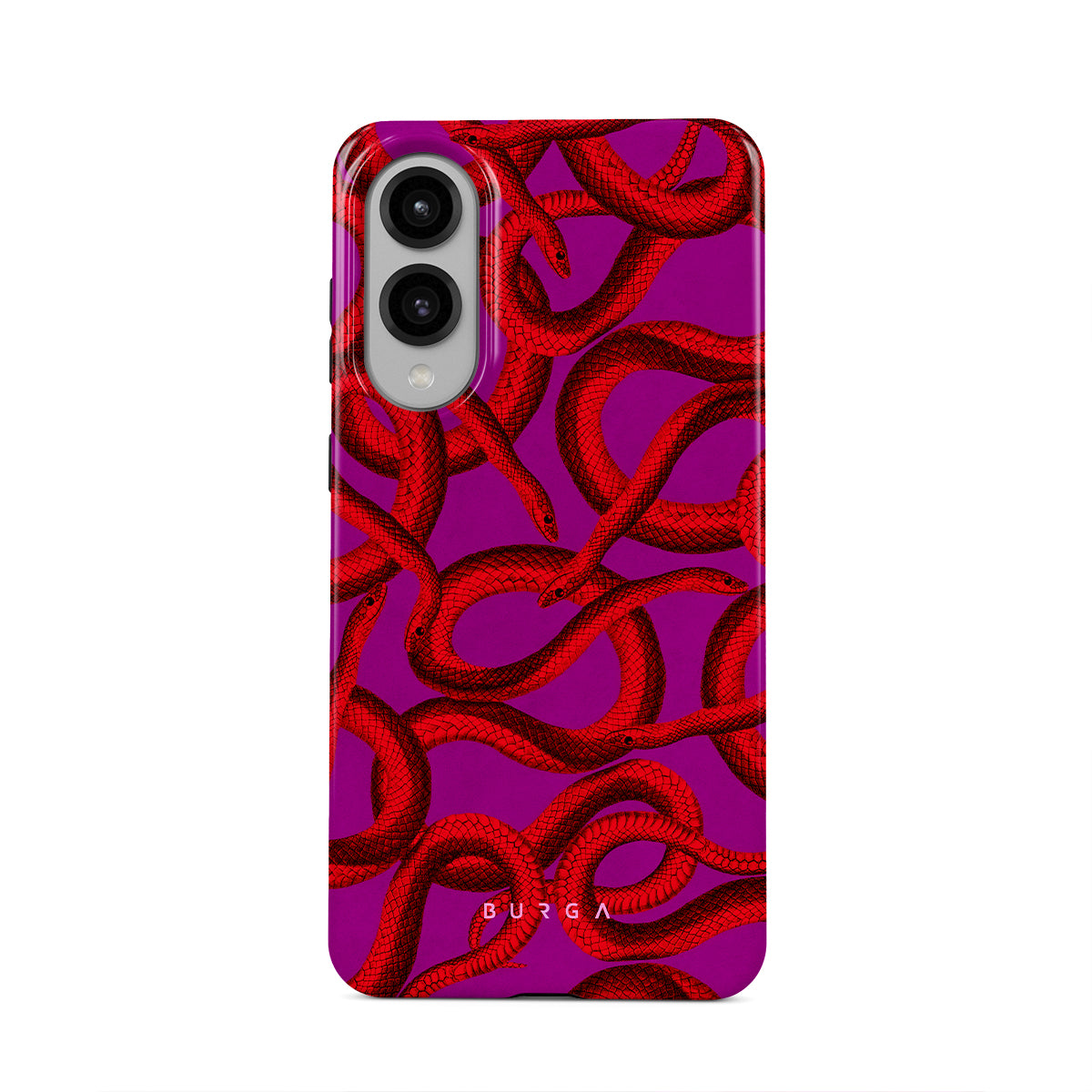 Watch Out Samsung Galaxy S25 Edge phone case design offers a fierce feel with a bright magenta colored background covered in red snakes pattern. Make a statement while protecting your phone, as this case is guaranteed to catch everyone's eye.