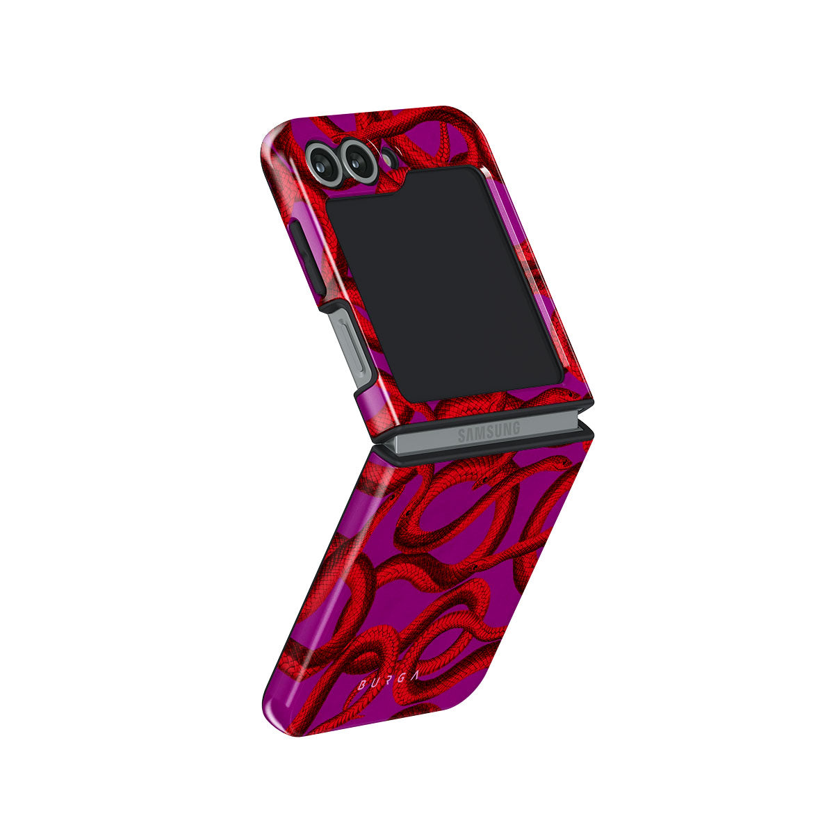 Watch Out Samsung Galaxy Z Flip 6 phone case design offers a fierce feel with a bright magenta colored background covered in red snakes pattern. Make a statement while protecting your phone, as this case is guaranteed to catch everyone's eye.