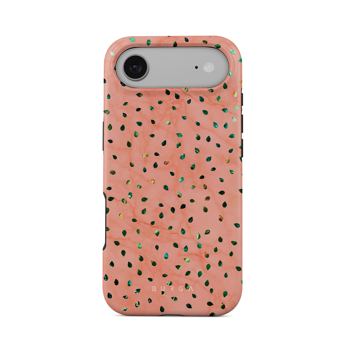 The Watermelon Shake iPhone Air phone case offers a playful take on design merging. The watermelon seed-like specks showcase striking tropical design fragments that add a splash of color to the fresh and breezy coral pink marble. This way, the funny protective phone cover becomes a perfect statement piece for your summer outfits.