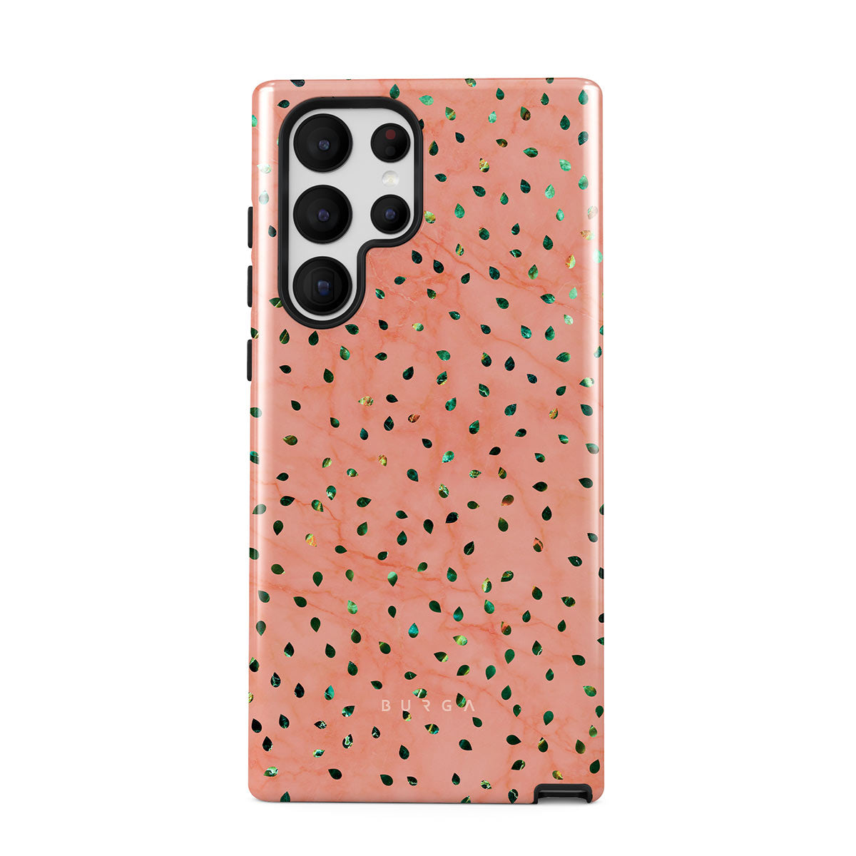 The Watermelon Shake Samsung Galaxy S22 Ultra phone case offers a playful take on design merging. The watermelon seed-like specks showcase striking tropical design fragments that add a splash of color to the fresh and breezy coral pink marble. This way, the funny protective phone cover becomes a perfect statement piece for your summer outfits.