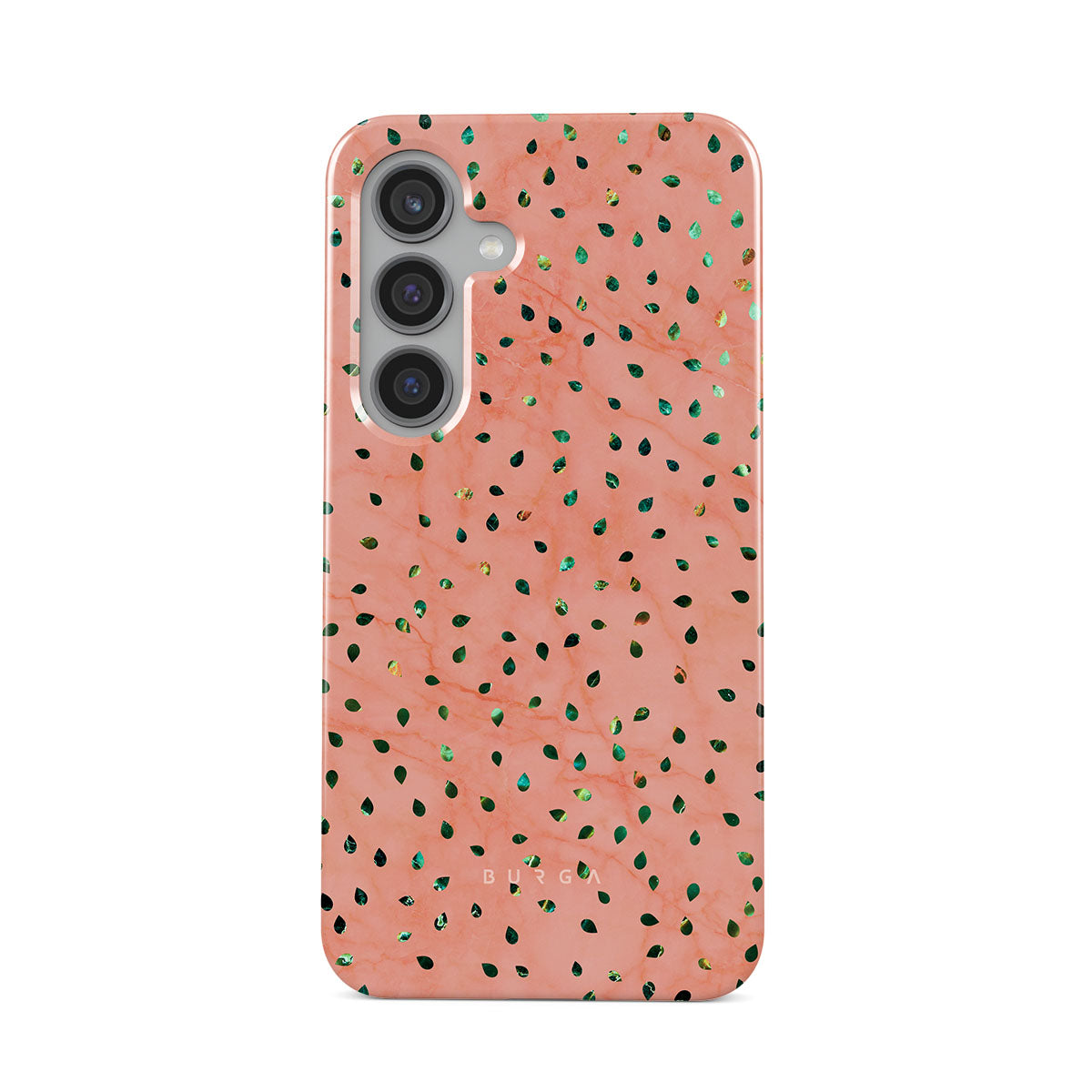 The Watermelon Shake Samsung Galaxy S24 phone case offers a playful take on design merging. The watermelon seed-like specks showcase striking tropical design fragments that add a splash of color to the fresh and breezy coral pink marble. This way, the funny protective phone cover becomes a perfect statement piece for your summer outfits.