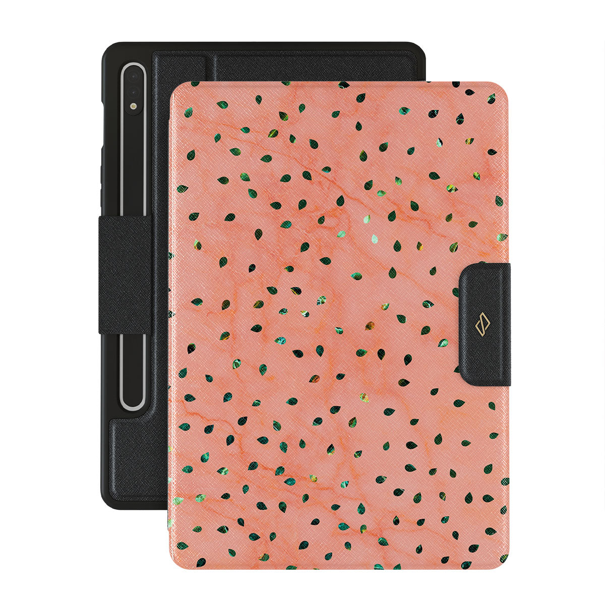 The Watermelon Shake Samsung Galaxy Tab S9 FE folio case offers a playful take on design merging. The watermelon seed-like specks showcase striking tropical design fragments that add a splash of color to the fresh and breezy coral pink marble. This way, the funny protective Galaxy Tab cover becomes a perfect statement piece for your summer outfits.