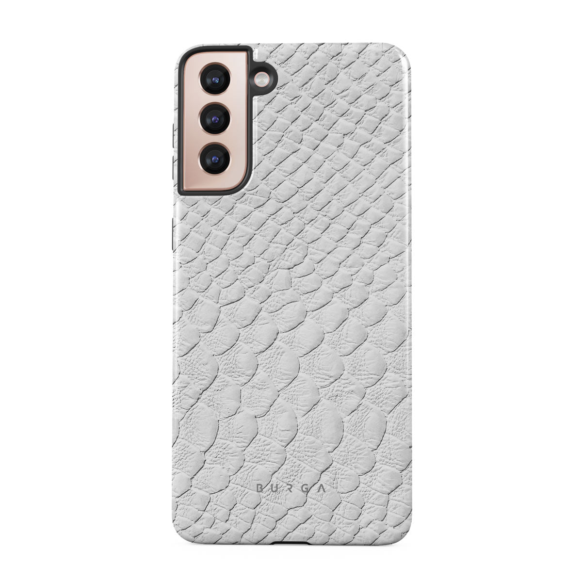 Glacial Desert Samsung Galaxy S21 Plus phone case features snakeskin design in glacial white color. The dangerous animal print will add confidence and a touch of luxury to your style while transforming your phone into a fashion accessory.