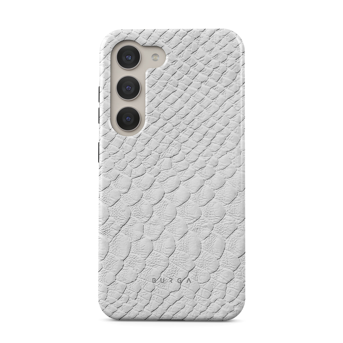 Glacial Desert Samsung Galaxy S23 phone case features snakeskin design in glacial white color. The dangerous animal print will add confidence and a touch of luxury to your style while transforming your phone into a fashion accessory.