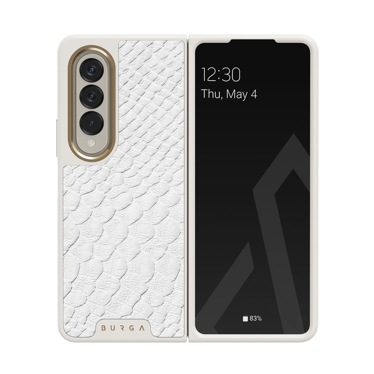 Glacial Desert Samsung Galaxy Z Fold 4 phone case features snakeskin design in glacial white color. The dangerous animal print will add confidence and a touch of luxury to your style while transforming your phone into a fashion accessory.