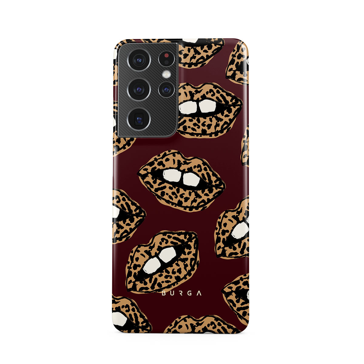 This design features: leopard print, lips, open lips, colored lips