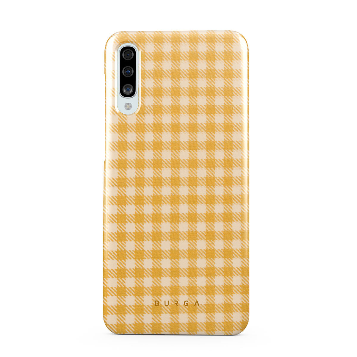 Always fashionable and always inviting, the Preppy Vichy fabric returns in our Tuscan Sun Samsung Galaxy A50 phone case. The brightness and warmth of this enchanting yellow plaid design indeed remind us of the always generous Tuscan Sun. You can add a piece of this playful squares pattern with you while keeping your phone out of harm's way!
